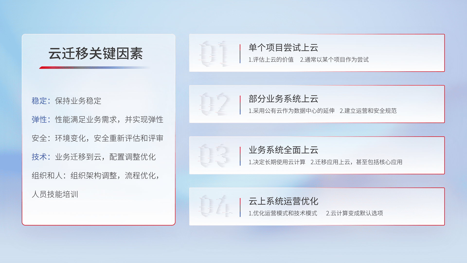 结合实际业务,,,,从规划设计、、、、云平台选型、、、云原生改造、、、、数据迁移、、、、集成交付,,,,迁移全过程为客户识别最佳上云路径,,,做好风险识别管理,,,,设计网络架构、、、、身份权限、、、、安全审计合规、、操作审计、、、、日志审计、、监控告警策略、、多站点容灾设计等,,对云上基础设施进行整体规划,,提升IT治理水平,,,,以满足弹性、、高可用、、、、高性能的需求。。