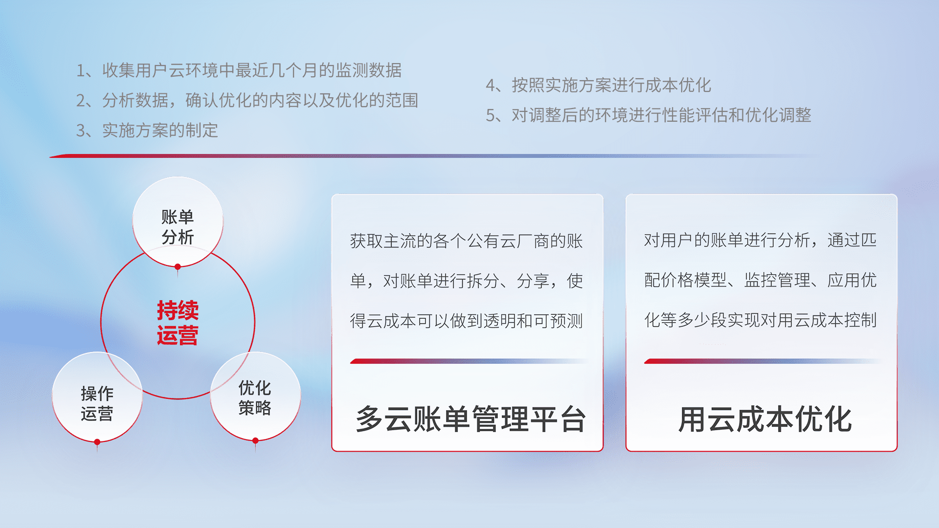 通过多云纳管,,,以统一的资源数据模型把客户的云资源进行抽象和封装,,进而实现对多云资源的统一操作,,保障云资源管理的可靠性、、、、稳定性与可用性。。量身定制化运维内容,,配置、、、开发运维、、、补丁管理、、备份、、、监控、、认证和访问管理、、、审计和日常巡检等,,保障在用云过程中的可靠度,,稳定度以及高可用率。。。。