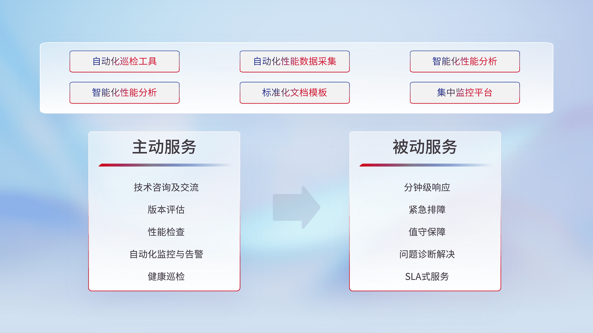 智能化工具和标准化文档,,保障服务质量,,,提供主动服务(包含技术咨询、、版本评估、、、性能检查、、、、自动化监控与告警、、、、健康巡检)和被动服务包含(分钟级响应、、、紧急排障、、、、值守保障、、、问题诊断解决、、SLA服务)。。。